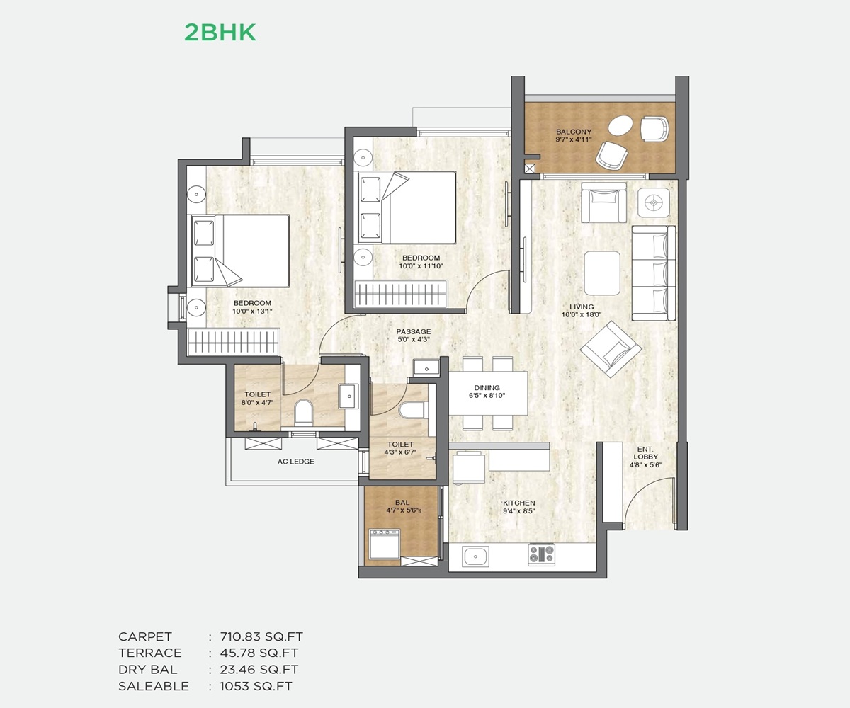 | 2 BHK | 725 Sq.Ft. | ₹ 69.85 - 70.95 Lacs* Onwards |